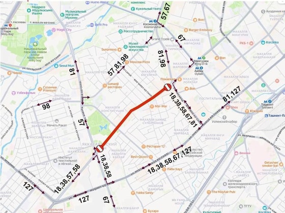 Маршруты №18, 38, 58 и 67 будут следовать по улицам Шахрисабз – Миробод – Нукус – Бобура – Шота Руставели.