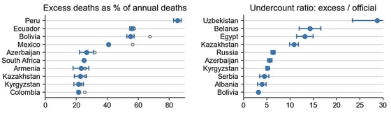 Сравнивая избыточный уровень смертности в постсоветских странах с официальными показателями COVID, специалисты обнаружили, что некоторые из стран Европы показали соотношение ниже единицы, предполагая, что местные чиновники добавили также и предполагаемые случаи смерти от COVID в свои подсчеты.