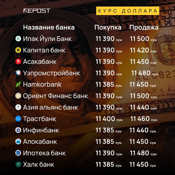 Коммерческие банки Узбекистана снова снизили курс доллара к суму. Некоторые из них предлагают купить доллар за 11 385 сумов, а продать за 11 420 сумов.