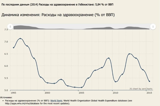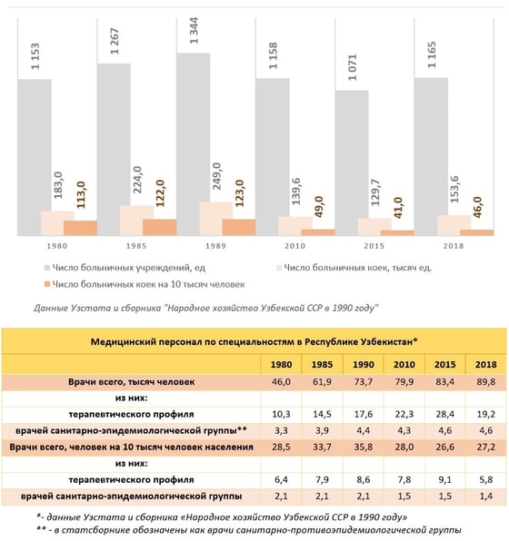 Это отразилось и на состоянии медицинской сферы. Если в 1989 году число больничных коек на 10 тысяч человек составляло 123 единицы, то в настоящее время – лишь 46. Количество больничных учреждений за это время сократилось с 1 344 до 1 165 единиц. Если в 1990 году в Узбекистане на 10 тысяч человек населения приходилось почти по 36 врачей (из них врачей санитарно-эпидемиологической группы – 2,1 человека), то в 2018 году этот показатель снизился на 24 процента – до 27 врачей (из них врачей санитарно-эпидемиологической группы – до 1,4 человека).