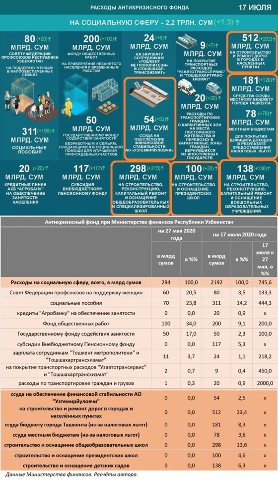Но нам важнее как тратятся средства Антикризисного фонда. По состоянию на 17 июля 2020 года расходы фонда составили 6,4 трлн сумов. По сравнению с данными на 27 мая 2020 года расходы на поддержку секторов экономики увеличились в 1,4 раза и достигли 2 трлн сумов (31,3 процента всех расходов фонда); на финансирование мероприятий по борьбе с коронавирусной инфекцией, соответственно, 1,6 раза, 907 млрд сумов и 14,2 процента; связанные с водоснабжением и ирригацией, соответственно, 1,2 раза, 602 млрд сумов и 9,4 процента; на строительство карантинных комплексов и спецбольниц, соответственно, 1,4 раза, 684 млрд сумов и 10,7 процента и социальную сферу, соответственно, 7,5 раза, 2,2 трлн сумов и 34,4 процента.