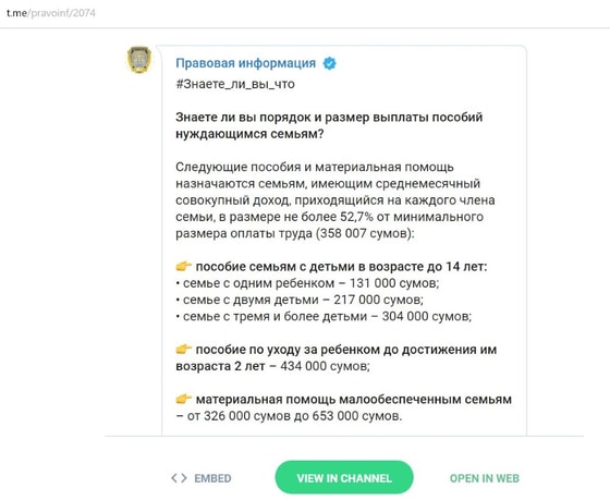 Сумма помощи составит 380 млрд сумов для финансовой помощи семей, включённых в списки «темир дафтар», или на одного члена семьи приходится в среднем по 220 тысяч сумов. «220 тысяч сумов на одного члена семьи. Если в семье двое, то 440 тысяч сумов, если трое — 660 тысяч сумов и так далее. Всего по нашим расчётам мы охватим 400 тысяч семей», — уточнили в Министерстве финансов.