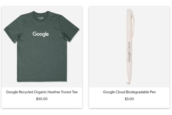 Эко-френдли мерч от Google: слева — футболка из органического хлопка и переработанного полиэстера, справа — биоразлагаемая ручка.