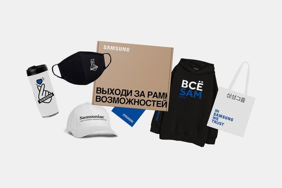 Мерч для сотрудников Samsung — это худи, шопер, маска и другие товары. В основе дизайна — фирменные цвета и мотивирующие слоганы.