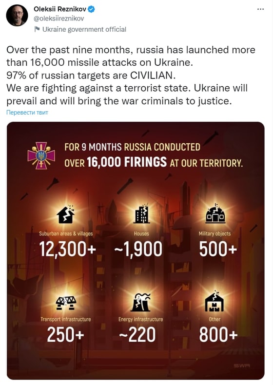 За последние девять месяцев Россия нанесла более 16 тысяч ракетных ударов по Украине. Об этом сообщил министр обороны Украины Алексей Резников.