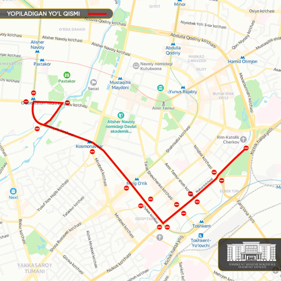 - улица Афросиаб — от пересечения с проспектом Ислама Каримова до пересечения с улицей Бешагач.