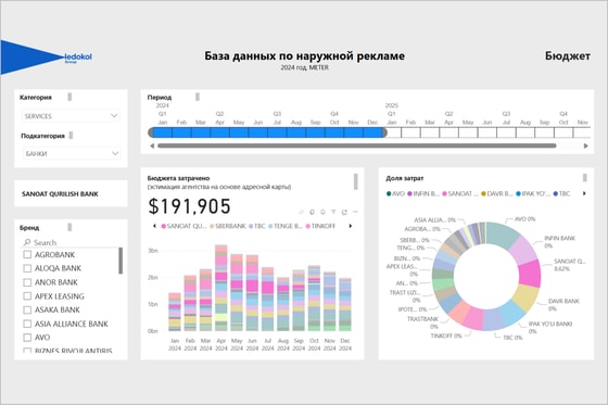 С 3 квартала 2023 года начал внедряться мониторинг наружной рекламы в Ташкенте — теперь у агентств и клиентов появилась возможность отслеживать активность категорий и оценивать долю голоса и прогнозные затраты основных игроков. На сегодняшний день доступен факт размещения за 2024 год (собралась база более 90% размещения с учётом небольшой погрешности) в разрезе категорий. В ближайшие пару месяцев, планируется внедрение библиотеки со всеми креативами, которые размещаются в Ташкенте на LED-экранах.