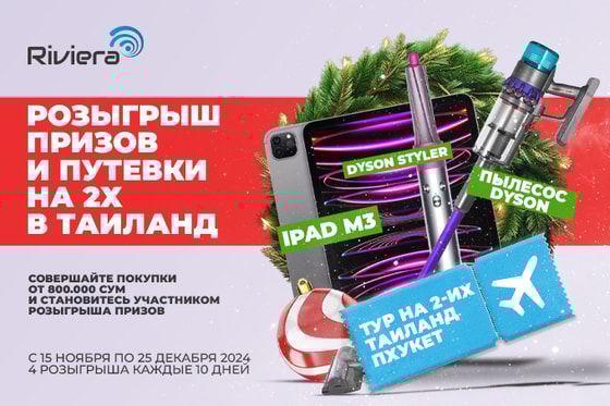 Совершайте покупки на сумму от 800 000 сумов и получайте шанс выиграть один из ценных призов! В розыгрыше представлены желанные подарки: пылесос Dyson Gen 5, стайлер Dyson, iPad M3, а также главный приз — путешествие на двоих в Таиланд (остров Пхукет).