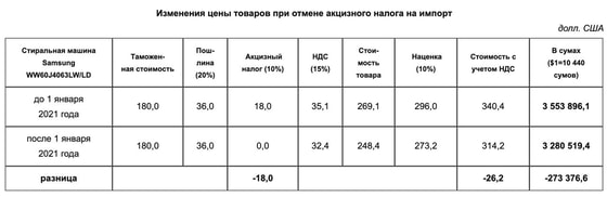 Узбекистан с 1 января 2021 года отменил акцизный налог по 73 товарным позициям при импорте, в том числе на электротехническую (холодильники, кондиционеры, стиральные машины), пищевую продукцию (маргарин, кондитерские и другие изделия), ковровые изделия и прочее.