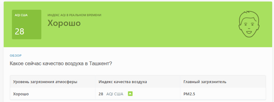 Так, в 13:55 станция мониторинга в столице Узбекистана показывала результат в 28 AQI. Концентрация PM2.5 — в 1,3 раза выше рекомендуемого ВОЗ среднегодового значения качества воздуха.