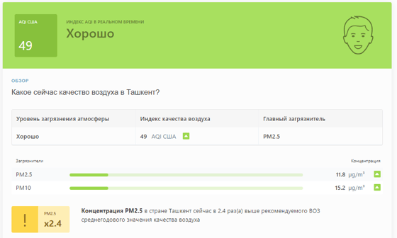 В 08:45 станция мониторинга в столице Узбекистана показывала результат в 49 AQI. Концентрация PM2.5 — в 2,4 раза выше рекомендуемого ВОЗ среднегодового значения качества воздуха.