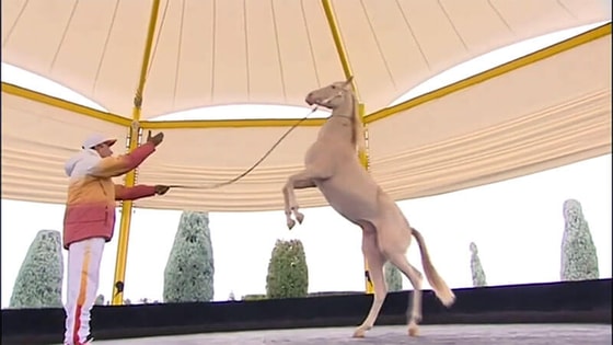 Выступление президента прошло в манеже Международного ахалтекинского конноспортивного комплекса. В пятнадцатиминутном сюжете показывается, как одетый в спортивный костюм Бердымухамедов в одиночестве наблюдает за выступлением группы национальных конных игр «Галкыныш», в то время как его подчиненные смотрят представление с противоположной трибуны.
