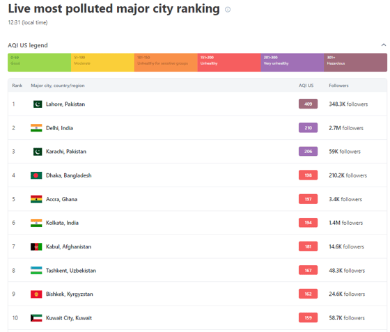 По состоянию на 12:31 станция мониторинга в столице Узбекистана показывала результат в 167 AQI. Качество воздуха в Ташкенте оценивалось как вредное.