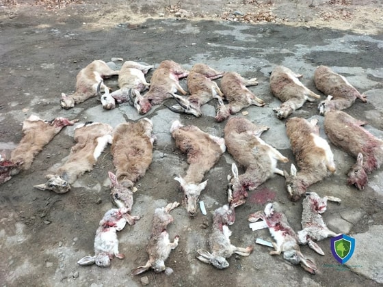 При осмотре крана «Тасберген» пустынной зоны Тахтакупырского района инспекторами было установлено, что на месте происшествия оставлены принадлежащие неизвестным лицам гильзы с патронами, посуда, хозяйственные принадлежности, ножи, топоры, топливо, косы, а также 14 особей джейранов, занесенных в Красную книгу, 5 диких кроликов.