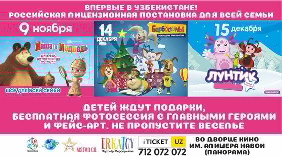 Кроме того, предлагаем вам окунуться в необычайный мир сказки и веселья 14 и 15 декабря. На сцене Дворца кино им. Алишера Навои (Панорама) состоятся новогодние выступления самой чудной семейки Барбоскиных и Лунтика.