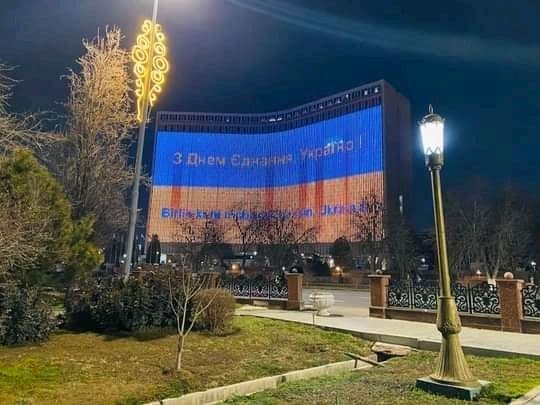 16 февраля на световом экране фасада Hotel Uzbekistan отобразили украинский флаг и надпись: «С днём единения, Украина». Данную информацию изданию Repost подтвердили в рекламном отделе гостиницы.