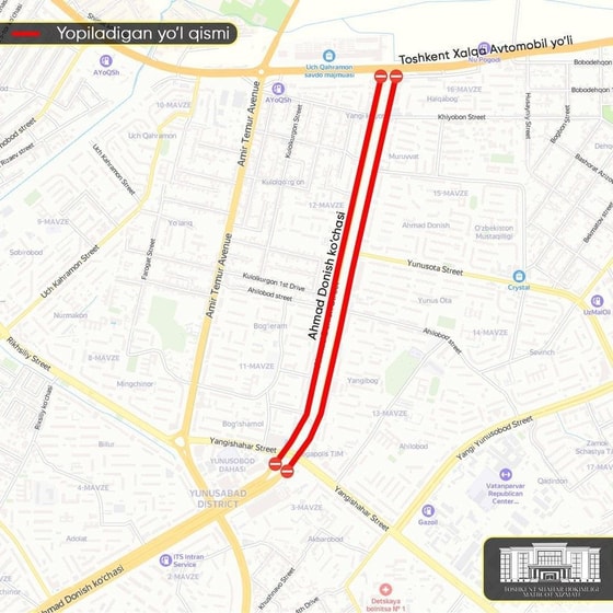 До 1 сентября участок дороги на улице Ахмада Дониша — от улицы Янгишахар до ТКАД — будет закрыт. Движение через перекрёсток вблизи ТРЦ Mega Planet в это время также будет закрыто, – говорится в сообщении.
