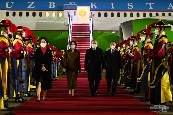 Как отмечается, в аэропорту города Сеула состоялась торжественная встреча главы Узбекистана. В том числе, был выстроен почетный караул и произведены артиллерийские залпы.