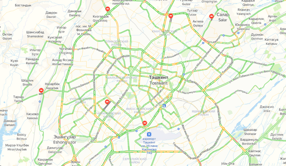Больше всего перегружены улицы Фараби, Сакичмон, Ислама Каримова, Шота Руставели, проспект Бунёдкор и Малая кольцевая дорога.