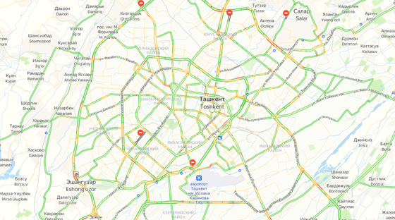 Больше всего перегружены улицы Шарафа Рашидова, Абдуллы Кадыри, Боткина, Эльбека, Махтумкули, Нукус, проспект Амира Темура и МКАД.