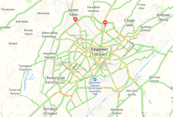 Больше всего перегружены улицы Эльбека, Нукус, Фергана Йули, Боткина, Махтумкули, Шарафа Рашидова, Осиё, Коратош, проспекты Амира Темура и Мустакиллик, а также МКАД.