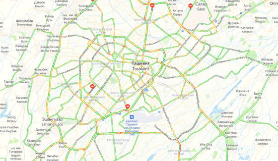 Больше всего перегружены улицы Паркент, Махтумкули, Нукус, Фергана Йули, Эльбека, Мехржон, Шота Руставели, Фурката, Коратош, проспекты Мустакиллик и Амира Темура, а также МКАД.