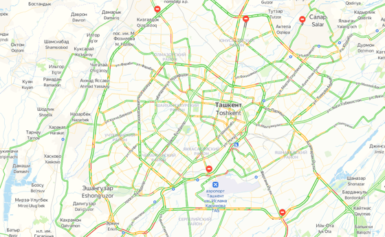 Больше всего перегружены улицы Махтумкули, Фергана Йули, Абдуллы Кадыри, Шарафа Рашидова, Паркент, Дурмон Йули и МКАД.