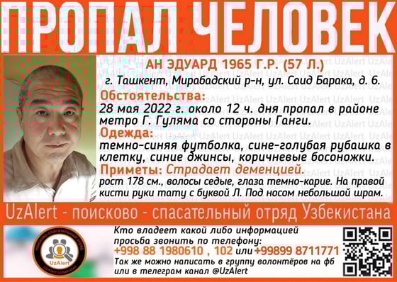 В Ташкент пропал без вести 57-летний Эдуард Ан. Ориентировка была опубликована UzAlert.