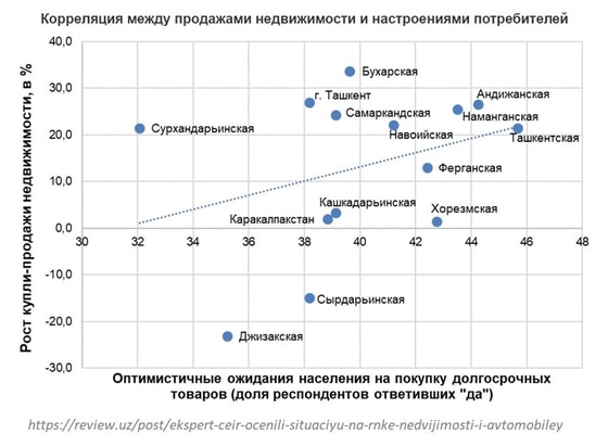 В этой связи вызывают интерес данные Центра экономических исследований и реформ, сотрудники которого проводят опрос для определения картины потребительских настроений (Индекс потребительских настроений). Анализ результатов этого опроса и изменения спроса на рынке недвижимости за январь 2021 года показал, что увеличение на 1 % доли оптимистичных ожиданий населения на покупку долгосрочных товаров, приводит к увеличению на 1,5 % количества сделок с недвижимостью.