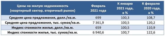 Индекс стоимости жилья (средняя цена предложения, скорректированная на усреднённый размер дисконта или скидки при совершении сделок между продавцами и покупателями квартир) в феврале 2021 года по сравнению с уровнем предыдущего месяца вырос в долларовом выражении на 0,5 % до значения 659 долларов/кв. м, а в сумовом, соответственно, на 0,7 % и 6 940,6 тысячи сумов/кв. м.