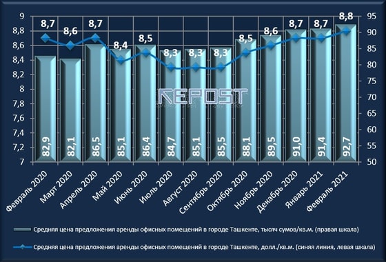 В феврале 2021 года средняя цена предложения аренды офисных помещений увеличилась на 1,1 % - до 8,8 доллара/кв. м. В национальной валюте стоимость аренды достигла 92,7 тысячи сумов/кв. м, увеличившись за месяц на 1,4 %. По сравнению с февралём 2020 года средний размер аренды офисов вырос в долларовом выражении на 1,1 %, а в сумовом – на 11,8 %.