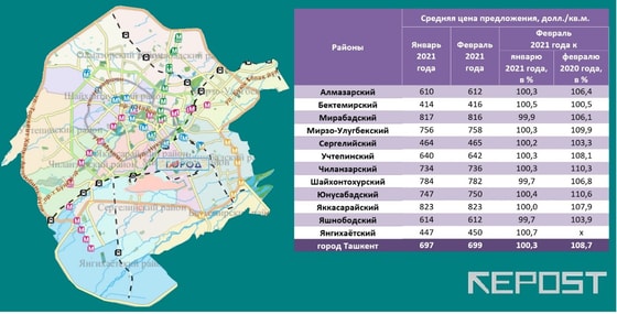 В феврале 2021 года в Ташкенте наблюдалось разнонаправленное движение цен предложения по районам. Наибольший прирост за месяц показала СЦП в районе-новичке: в Янгихаётском районе рост средней цены предложения составил 100,7 %. Среди районов, в которых наблюдалось снижение СЦП: Шайхонтохурский и Яшнободский районы – по 0,3 %, а также Мирабадский (на 0,1 %).