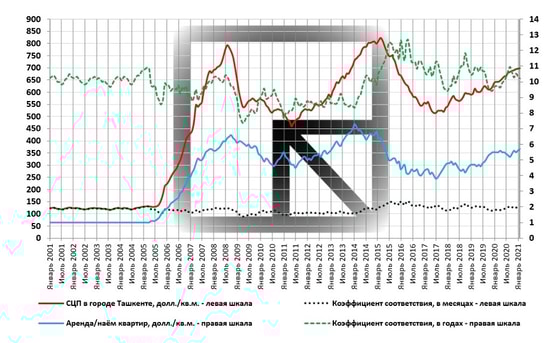На графике представлены коэффициенты соответствия величин найма и стоимости жилья. Это время (месяцы или годы), необходимое для того, чтобы сумма платы за наём жилья сравнялась с рыночной стоимостью квартиры. В феврале 2021 года этот показатель в среднем по Ташкенту составил 123 месяца (по сравнению с предыдущим месяцем показатель сократился на 1 месяц) или 10 лет и 3 месяца.