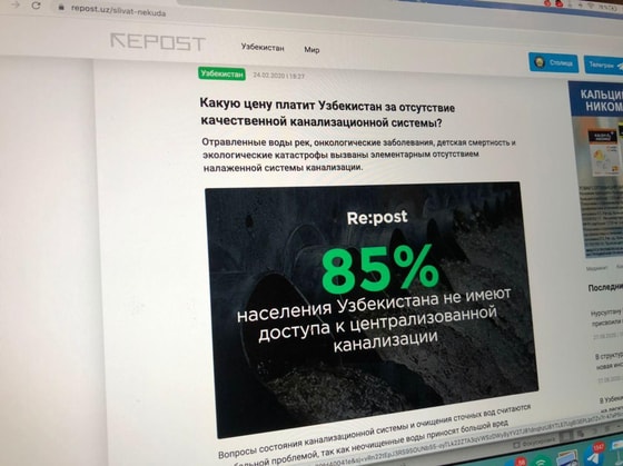 Мультимейдийный материал журналиста Repost Нодирбека Нортураева о том, какую цену платит Узбекистан за отсутствие качественной канализационной системы занял первое место в номинации «Власть и общество» от Узбекистана на региональном конкурсе MediaCAMP Award 2020. Узбекистан был представлен 72 заявками, еще 210 заявок пришлось на Казахстан, Кыргызстан, Таджикистан и Туркменистан. Победа в региональном конкурсе позволила журналисту Repost пройти в финальный этап MediaCAMP Award 2020, который пройдет в сентябре.