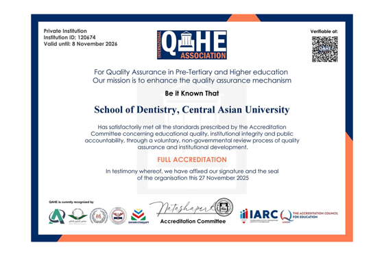 Получение полной международной аккредитации укрепляет академический статус Школы стоматологии Central Asian University и подтверждает ее роль в подготовке квалифицированных, практико-ориентированных специалистов, способных эффективно отвечать современным вызовам системы здравоохранения.