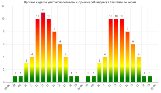 Сегодня (23 июня) в Ташкенте ожидается экстремальный 11-балльный уровень ультрафиолетового излучения, следует из данных сервиса Meteonova.