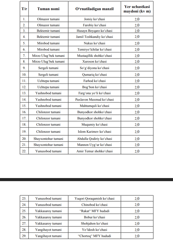Их установят в 12 районах на участках площадью 2 кв. м. Ниже представлен список локаций: