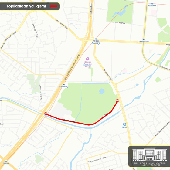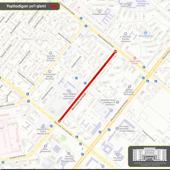 - улица Муминова — от пересечения с улицей Шахриабад до пересечения с улицей Дурмон йули.