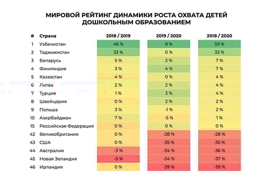 В десятку лучших стран помимо Узбекистана вошли Таджикистан (+33%), Беларусь (+7%), Финляндия (+7%), Казахстан (+4%), Литва (+4%), Турция (+4%), Швейцария (+2%), Польша (+2%) и Азербайджан (+1%). В более чем половине стран рейтинга наблюдается снижение охвата детей дошкольным образованием в 2018-2020 гг.