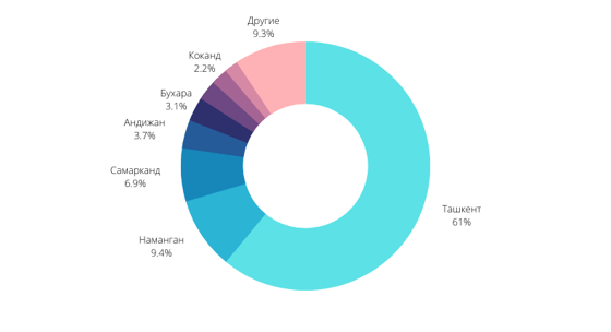 Чаще всего упоминания операторов связи встречаются в публикациях пользователей из Ташкента (61%). Почти 18% упоминаний приходятся на жителей Ферганской долины. Пользователи из Самарканда, Бухары и Нукуса обеспечили порядка 12% упоминаний. 9,3% упоминаний распределены между жителями остальных регионов страны.