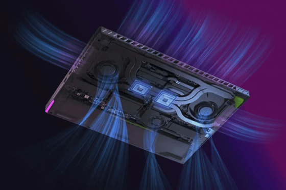 Для хорошего охлаждения мощных компонентов корпус и материнская плата ноутбука были оптимизированы таким образом, чтобы вместить большой радиатор во всю его ширину, а также освободить пространство для свободного вывода горячего воздуха.