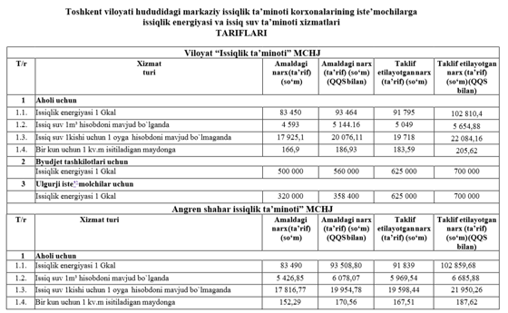 Расценки повышаются на основе предложений, внесенных отопительными организациями Ташобласти.