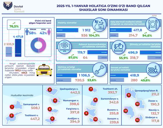 По состоянию на начало 2025 года число самозанятых в Узбекистане превысило 4,4 млн, сообщили в Государственном налоговом комитете.
