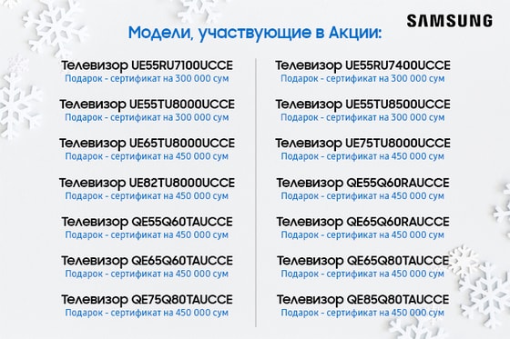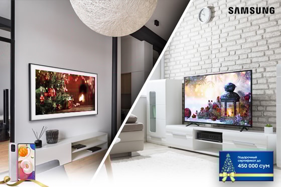 При покупке телевизора UHD или QLED можно стать обладателем сертификата на сумму 300 000 сум или 450 000 сум. Подарок можно использовать для оплаты следующих покупок в том же магазине, где был приобретен телевизор.
