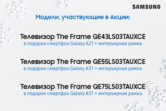 Приобретая телевизор Samsung The Frame, покупатель получает в подарок один из телефонов Samsung Galaxy серии A и интерьерную рамку для телевизора.