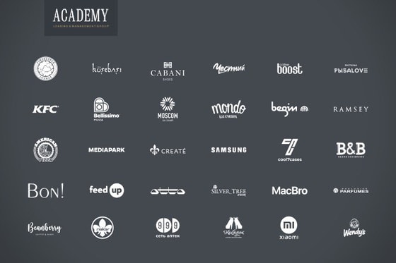 На сегодняшний день более 50 мировых и местных брендов с разных сегментов бизнеса доверяют управляющей компании ACADEMY Leasing & Management Group. Среди них такие бренды, как: KFC, Tony Molly, TimeKeeper, B&B, Tom Yum Bar, Wendy’s, Begim, Silver Tree, Samsung, Xiaomi, Bellisimo Pizza, Mondo, Feed Up, Kosebasi и многие другие.
