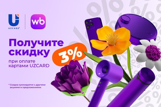 Wildberries и UZCARD дарят всем покупателям дополнительную скидку 3% на все покупки при оплате картой UZCARD.