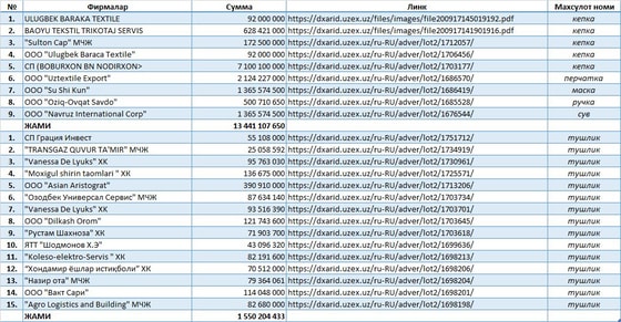 6. В связи с тем, что контролеры группы и сотрудники, привлекаемые к данному процессу, находились в зоне проведения тестовых испытаний в период с 06:00 до 20:00 часов, в целях своевременного обеспечения их качественным обедом, в каждом регионе были подписаны контракты с различными предприятиями. При этом самый дорогой контракт был для города Ташкента, на 13 дней было поставлено 1 2610 обедов (одноразовая посуда, основное блюдо, салат, хлеб, вода, булочка) на общую сумму 390 910 000 сумов. Также был подписан самый дорогой договор в Самаркандской области, по которому на 12 дней было поставлено 5 467 обедов, стоимостью в 25 000 сумов каждый, на общую сумму 136 675 000 сум.