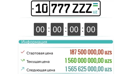 За автономер 10 777 ZZZ предложили 1 млрд 560 млн сумов ($122,2 тысячи) — в 8,3 раза выше начальной цены в 187,5 млн сумов.