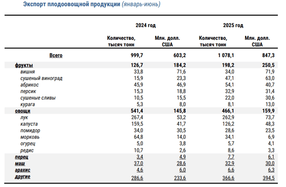 В январе-июне 2025 года Узбекистан экспортировал за рубеж свыше 1 млн тонн фруктов и овощей на $847,3 млн, сообщает Комитет по статистике.